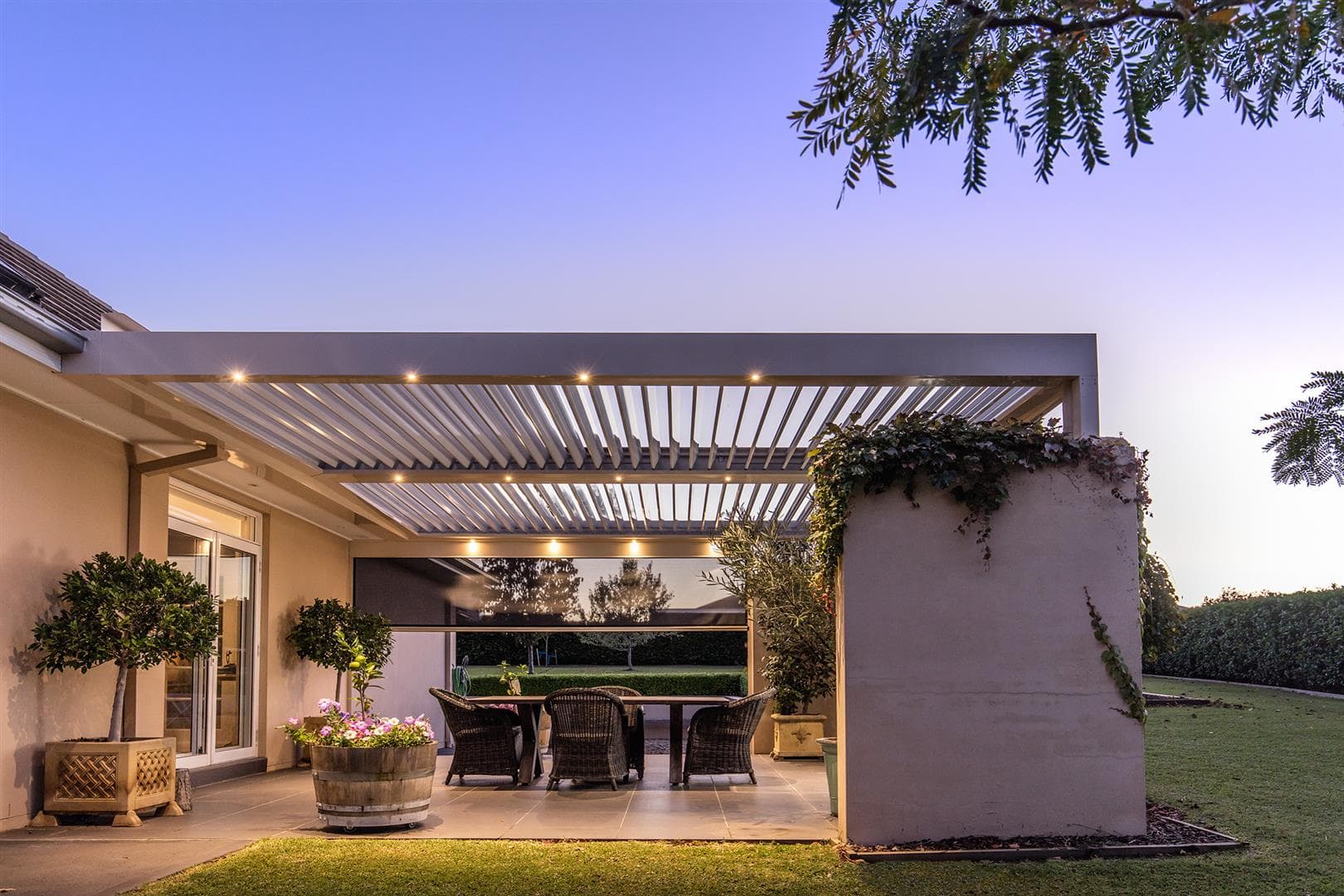 With an already beautiful outdoor space to work with, we custom designed this Wilton pergola with an opening roof system that complemented the existing landscape of the modern country home.